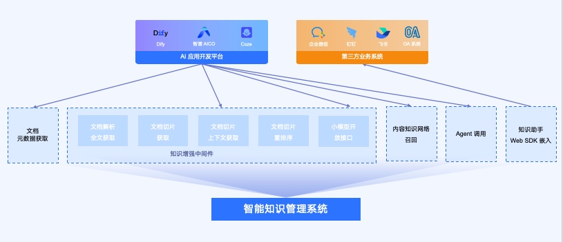 | 知识增强中间件 | 包含文档的解析全文获取,文档切片召回,文档切片上下文召回,文档切片重排序,小模型访问接口 | restful api | Bearer token | 系统账户和应用账户 |